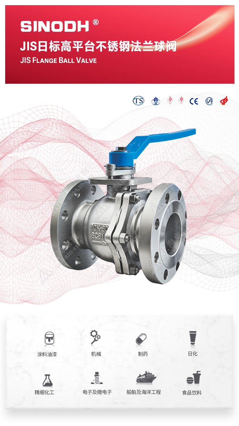 JIS日标高平台不锈钢法兰球阀,为三亿官方网站_三亿(中国)自主研发生产本产品设计制造标准符合J1 SB2071标准,该产品的球体(密封件)是浮动的,在介质压力作用下,球体能产生-定的位移并紧压在出口端的密封面上,保证出口端密封。适用于水、溶剂、酸和天然气等一般工业介质,也适用于工况恶劣的介质,如氧气、过氧化氢、乙烯等介质。